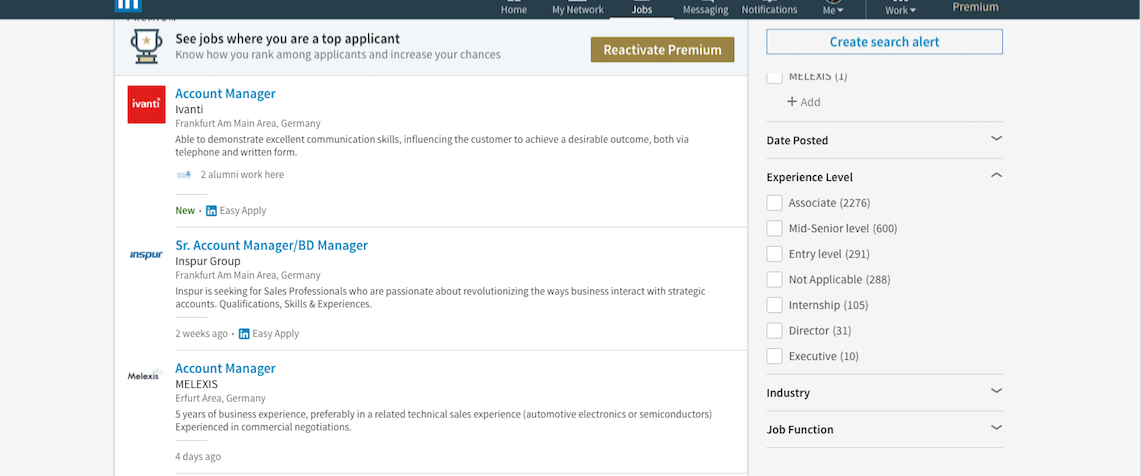 Bu bahsettiğimiz sitelerde kendiniz için pozisyon ararken, ne kadar çok filter kullanırsanız, arattığınız pozisyonların size uygunluğu o kadar artar. Mesela ‘Account Manager’ pozisyonlarına başvurmak istiyorsunuz ve LinkedIn’de arattınız, yandaki filtrelerden, iş deneyiminize göre filtrelerseniz, boşuna size uygun olmayan pozisyonlara başvurmaktan kurtulursunuz. Aşağıdaki görselde göreceğiniz gibi, Almanya’da ‘Account Manager’ pozisyonu arattığınızda, iş ilanlarını ‘Mid-Senior Level – Associate – Entry Level – Internship’ gibi farklı pozisyonlara ayırdıklarını görüyorsunuz. Yeni mezunsanız, Mid-Senior’u seçeneklerden eleyerek zaman kazanabilirsiniz.