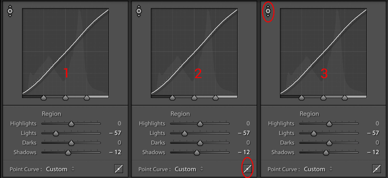 Çok basit olarak söyleyecek olursak yukarıda beyaz, siyah ve gölge ayarlarının daha detaylı bölümü diyebiliriz. Yani burada gölgeleriniz daha açık veya karanlık yapabilirsiniz. Herbir ayarın grafikte(aşağıdaki görseldeki gibi) belli bir yeri var. Yani siyahın grafikteki yeri belli ve oradan ayarlarınızı değiştirebiliyorsunuz. Aşağıda olduğu gibi fotoğrafa göre kendi değerlerinizi verebilirsiniz. 2. Görselde gördüğünüz kutucuk ile sayısal değerler yerine grafik üzerinde noktalar koyarak da düzenleyebilirsiniz. 3. Görselde ise en sol üst köşedeki işarete tıklayarak fotoğrafın üzerindeki bölgelerin grafikte nerelere denk geldiğini görebilir ve böylece beğenmediğiniz bölgelere göre fotoğrafı düzenleyebilirsiniz.